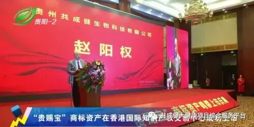 2019年11月19日下午,贵州共成健生物科技有限公司“贵赐宝”商标资产在香港国际知识产权交易中心成功鸣锣上市,上市庆典在贵州国际会议中心隆重举行。赵阳权董事长在会上指出,贵州共成健生物科技有限公司一直以服务人类健康、科技兴企、诚信经营为己任,打造百年基业。公司将以生态农业产业化发展为目标,借助贵州刺梨资源优势、地域优势、科研优势,创造贵州的经济奇迹。贵赐宝成为中国刺梨产业首家商标资产上市品牌。