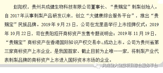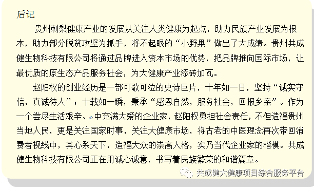 赵阳权的贵州共成健生物科技有限公司研发的贵赐宝系列产品荣获国际食品清真认证,国家专利35项,实验证明,刺梨产品对于解酒护肝、舒缓便秘的效果立竿见影,对于胃肠不好、青春痘、老年斑、癌症等食用人群身体得到改善或痊愈,也由此引出了众多病患者亚健康调理成功的动人故事。贵州共成健生物科技公司成立于 2017年,是贵州刺梨产业链的标杆企业,一直以服务人类健康、科技兴起、诚信经营为己任,借助龙里县刺梨资源优势,地域优势、科研优势,以原生态、产业化、规模化发展为目标,坚持走产业融合+农产电商+金融驱动的三位一体的发展策略,倾力打造中国刺梨产业的生态航母。